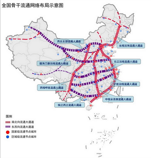 按照規劃目標和總體布局思路,確定“3縱5橫”全國骨干流通大通道。