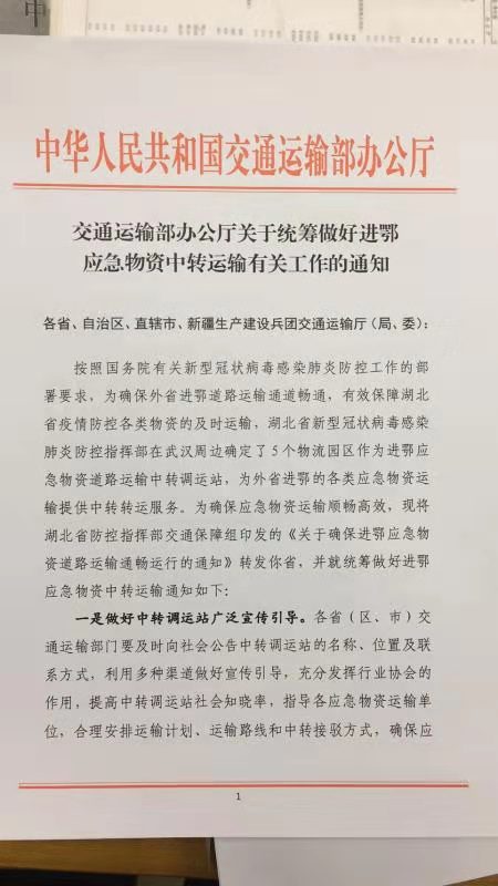 組《關于確保進鄂應急物資道路運輸通暢運行的通知》