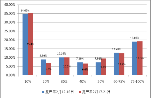 但從復產情況來看,由于人員流動總體受限、企業主體責任風險較高、上下游需求不明朗等原因,調查企業復產率仍然較低。企業復產率由調查開始(2月12-16日)的35.1%回升到調查結束(2月17-21日)的35.5%,回升幅度遠低于開工比例,反映出當前企業存在復工不復產現象,復工企業運轉能力不高,只占到滿負荷運轉的35.5%。具體來看,近7成(68.3%)的企業復產率不到50%,一半的企業(52.4%)復產率在30%以下,三分之一以上的企業(35.4%)復產率不足10%。