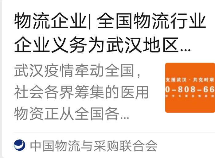 中國物流與采購聯合會、全國物流行業、物流企業、物流人,給武漢、湖北人民無疆大愛,給抗疫主戰場武漢、湖北物流行業關心支持。
