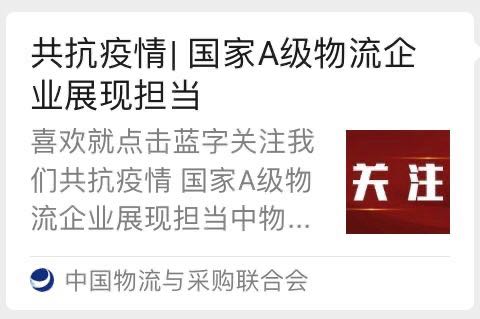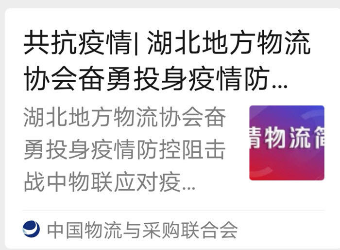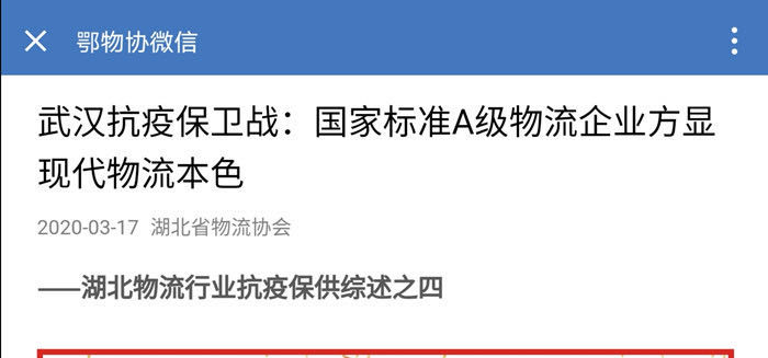 3月17日,湖北省物流協會在“鄂物協微信”以湖北物流行業抗疫保供綜述形式,刊發微信《武漢抗疫保衛戰:國家標準A級物流企業方顯現代物流本色》。