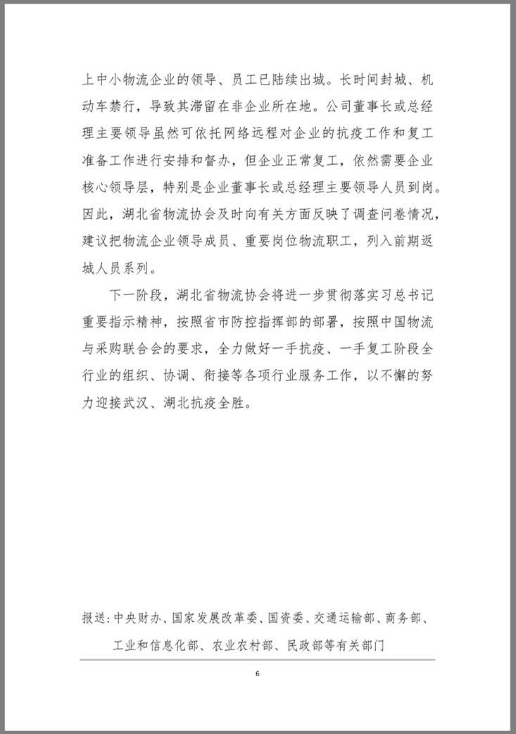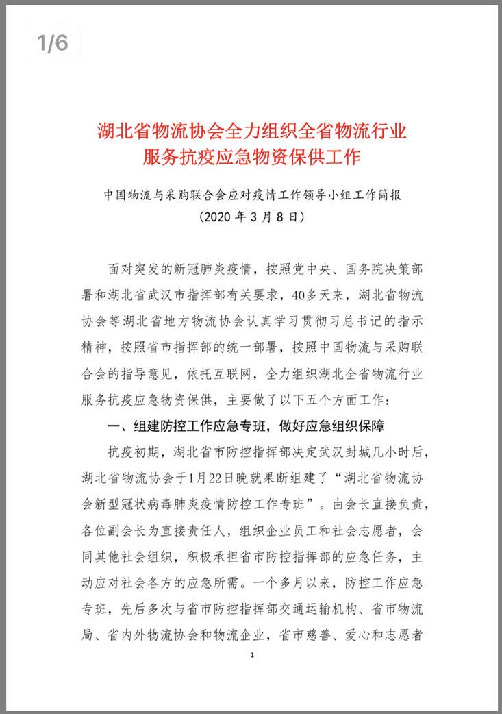 ★ 3月3日,在武漢、湖北抗疫進入最吃勁階段,湖北省物流協會以鄂物協字〔2020〕6號文,將武漢“封城”40天來全省物流行業抗疫保供、復工復產中的主要作法、突出成效、具體問題,向中國物流與采購聯合會上報了《關于我會一個多月來抗疫保供行業服務工作情況匯報》。