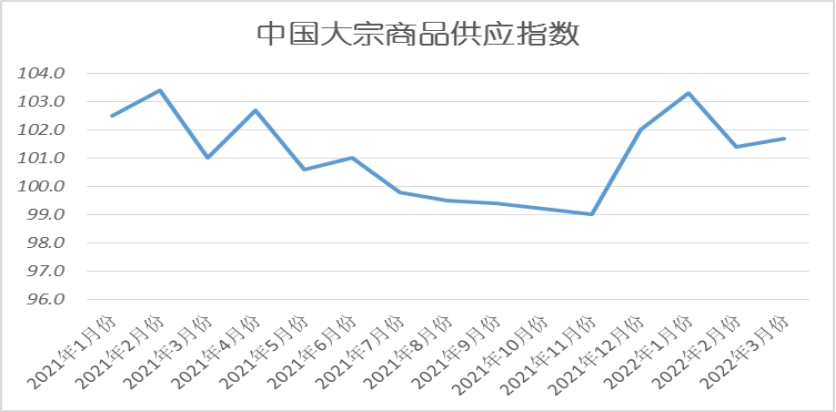 2022年3月份,大宗商品供應指數止跌回升,當月較上月回升0.3個百分點,至101.7%,顯示隨著傳統旺季的來臨,商品生產企業預期良好,生產熱情高漲,產量穩中有升,市場供應持續增加,但隨著疫情的多點散發,對物流運輸造成較大影響,部分生產企業因為原材料庫存偏緊以及銷售不暢被迫減產,供應增長的節奏也有所減緩。各主要商品中,鋼鐵供應量止跌回升,鐵礦石和化工供應量繼續增加,且增速加快,煤炭和有色金屬供應量雖繼續增加,但增速有所放緩,成品油和汽車供應量則出現下降格局。