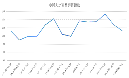 2023年11月份,大宗商品銷售指數連續兩個月出現回調,當月較上月回落1.5個百分點,至101.3%,顯示國內大宗商品市場需求進入淡季,本月市場銷售量保持回升。但增速繼續減緩。這主要是:首先,基建和地產方面,一萬億特別國債的落地實施以及“三大工程”的穩步推進,加之國家層面出臺了系列措施推進新一輪的保交樓工作,對大宗的市場需求有所支撐;其次,10月份人民幣貸款和社會融資規模增量均較去年同期大幅增加,資金狀況有所改善,市場交投較前期更為活躍;再次,市場價格的回落抑制了投機需求的釋放,終端需求企業也以消耗庫存為主,備貨需求不高;最后,進入冷冬的大宗需求淡季,銷售增速減緩符合市場規律。各主要商品中,有色金屬和汽車銷售量繼續增加,增速繼續加快,鋼鐵、成品油和化工銷售量均有所增加,但受企業生產利潤收縮的影響,增速有所減緩,本月原煤受港口庫存持續高位、下游采購不及預期的影響,市場銷售量出現下降的格局,鐵礦石受到高爐檢修數量增多的影響,鋼廠對鐵礦石需求同步減弱,市場銷售量出現下降 。