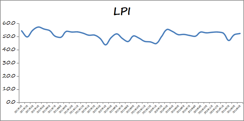 中國物流與采購聯合會發布的2024年4月份中國物流業景氣指數為52.4%,環比回升0.9個百分點。其中,業務總量指數、新訂單指數、設備利用率指數、固定資產投資完成額指數和業務活動預期指數連續回升,企業經營效益基本穩定。