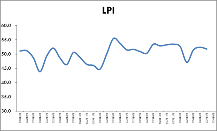 中國物流與采購聯(lián)合會發(fā)布的2024年6月份中國物流業(yè)景氣指數(shù)為51.6%,環(huán)比回落0.2個百分點。分項指數(shù)中業(yè)務總量指數(shù)、新訂單指數(shù)和業(yè)務活動預期指數(shù)保持景氣區(qū)間,服務價格指數(shù)環(huán)比平穩(wěn)回升。