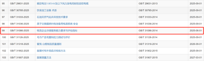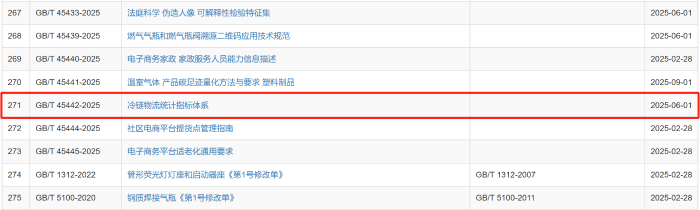 2025年2月28日,國(guó)家市場(chǎng)監(jiān)督管理總局、國(guó)家標(biāo)準(zhǔn)化管理委員會(huì)批準(zhǔn)發(fā)布282項(xiàng)國(guó)家標(biāo)準(zhǔn),其中包括由全國(guó)物流標(biāo)準(zhǔn)化技術(shù)委員會(huì)提出并歸口的《冷鏈物流統(tǒng)計(jì)指標(biāo)體系》(GB/T 45442-2025)和《物流企業(yè)冷鏈服務(wù)能力要求與評(píng)估指標(biāo)》(GB/T 31086-2025)兩項(xiàng)國(guó)家標(biāo)準(zhǔn)。