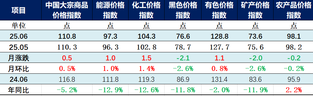 由中物聯大宗商品流通分會和上海鋼聯等單位聯合調查,中國物流與采購聯合會發布的2025年6月份中國大宗商品價格指數(CBPI)為110.8點,環比上漲0.5%,同比下跌5.2%。從指數運行情況來看,隨中美倫敦經貿會談再次釋放積極信號,企業生產經營活動繼續回暖,指數連續兩月溫和回升,表明二季度大宗商品市場總體穩定,呈穩中有進發展態勢。但當前外部不確定、不穩定風險較多,部分行業有效需求不足、低價無序競爭等問題仍有待破解,鞏固增強經濟回穩向好基礎,需加大宏觀經濟政策逆周期調節力度,進一步發揮大宗商品流通業擴內需、穩增長、促發展重要作用。