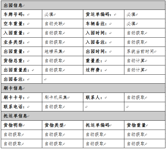 車輛出園時必須提供貨運單詳細清單,出園門禁人員新增出園記錄時輸入車輛信息自動調(diào)出該車輛的貨運單信息,車輛由出園地磅進行稱重,自動采集出園重量信息,正常情況禁止人為更改重量信息,根據(jù)地磅稱重自動判斷裝車重量與貨運單記錄貨物重量是否相符,若重量在允許范圍之內(nèi)方可刷卡放行,收回入園卡并清空卡里信息,完成之后自動修改車輛貨運單狀態(tài),自動記錄本次貨運單出園操作,若重量不符否則由車輛相關(guān)人員與物流企業(yè)進行溝通重新對貨運單進行加碼操作,加碼操作需另行記錄,為后期提供加碼匯總信息查詢。當(dāng)重量符合出園標準之后,系統(tǒng)根據(jù)基礎(chǔ)費用設(shè)置自動計算出園相關(guān)費用,車輛相關(guān)人員進行刷卡自動繳費,打印相關(guān)票據(jù)(支持出園票據(jù)補打),出園門禁人員保存出園記錄后由系統(tǒng)自動控制出門機械道閘,實現(xiàn)道閘自動化控制,對信息不符合園區(qū)規(guī)定的車輛不予放行。