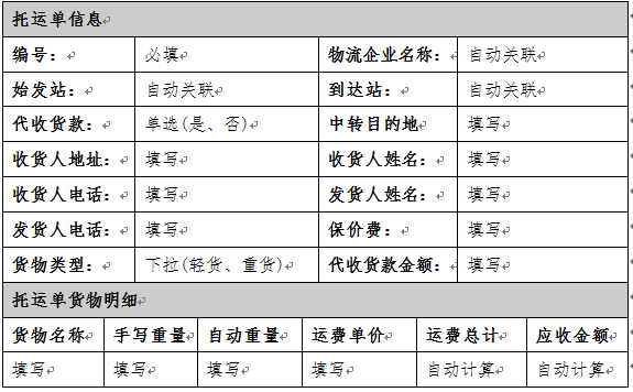 托運單信息包含: 托運單編號、企業(yè)名稱、始發(fā)站、到達站、是否為代收貨款、中轉(zhuǎn)目的地、收貨人地址、收貨人姓名、收貨人電話、發(fā)貨人姓名、發(fā)貨人電話、保價費、貨物類型、貨物件數(shù)、代收貨款金額、是否已繳款、創(chuàng)建時間、收款時間、出園時間,貨物信息 (貨物信息包含:貨物名稱、手寫重量、自動重量、運費單價、運費總計、應(yīng)收金額)等詳細信息。托運單添寫完成后,根據(jù)貨物類型、線路等信息、貨物重量,自動計算出相應(yīng)貨物應(yīng)繳運費價格、運費總合計、應(yīng)收金額。