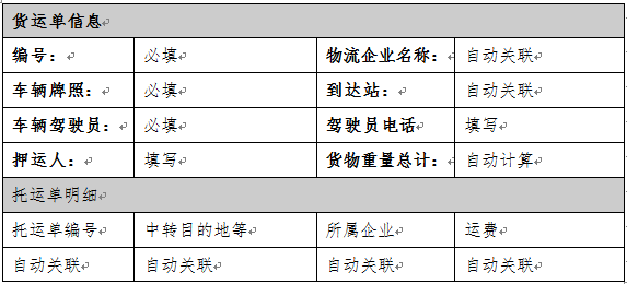 貨運單信息包含: 貨運單編號、到達站、物流企業(yè)名稱、 車輛牌照、車輛駕駛員、駕駛員電話、押運人、貨物重量總計、托運單明細(托運單編號、所屬企業(yè),中轉(zhuǎn)目的地、運費等)等詳細信息。