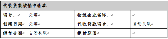 對產(chǎn)生拒付業(yè)務(wù)的代收貨款記錄,物流企業(yè)用戶可以進行拒付核銷操作,并生成相關(guān)核銷代收貨款申請單,便于銀行及時對代收貨款進行注銷操作。