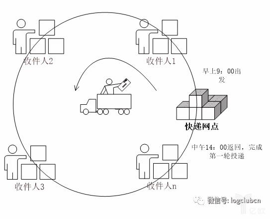 固定的投遞員在固定時間從固定的末端網(wǎng)點取貨,按照相對固定的投遞線路,在相對固定的區(qū)域進行投遞,是“一點取貨,多點投遞”的milk run模式的按時(計劃)投遞,可以事先計劃安排,實現(xiàn)最優(yōu)分配,理論上是確定條件下的路徑最優(yōu)化問題。