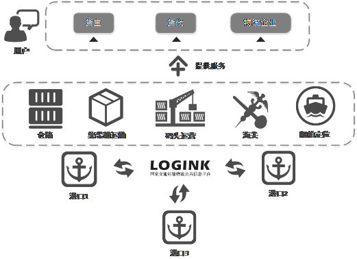 縱向上是打通港口與物流企業之間的數據斷層,港口將數據接口提供到國家物流平臺后,借助國家物流平臺的平臺渠道向外提供公共服務。