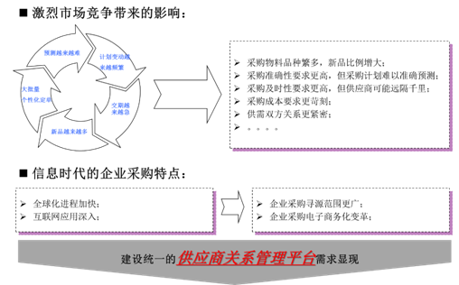 隨著全球經(jīng)濟(jì)的一體化,激烈的企業(yè)市場競爭,要求在優(yōu)化企業(yè)內(nèi)部資源的基礎(chǔ)上,如何整合外部的供應(yīng)商資源,以應(yīng)對環(huán)境和競爭對手的挑戰(zhàn)成為企業(yè)需要首先考慮的重要問題。五糧液希望通過管理變革及信息工具的使用,建立內(nèi)部的需求、采購、監(jiān)督等部門之間、供需雙方之間的信息共享和交互的系統(tǒng)顯得尤為重要和迫切。