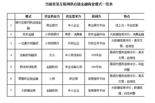 當前,“互聯網+供應鏈金融”商業模式變化的關鍵在于居間主體的多元化,即在“資金供應與需求”之間的撮合主體。當前“互聯網+供應鏈金融”的典型模式如下表: