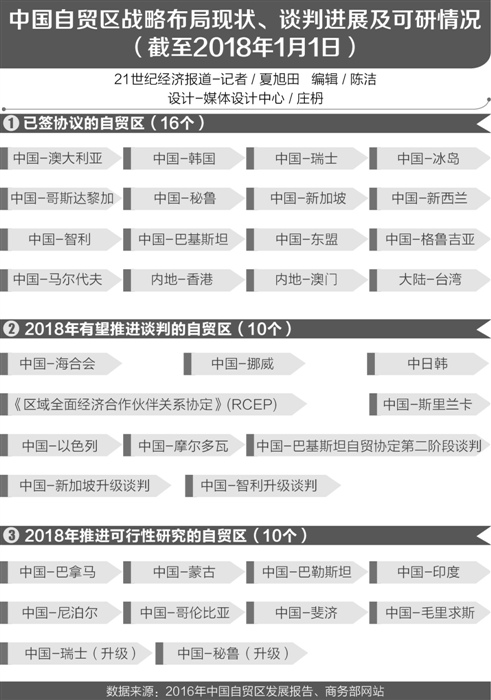 在近日的全國(guó)商務(wù)工作會(huì)議上,21世紀(jì)經(jīng)濟(jì)報(bào)道記者從商務(wù)部國(guó)際司司長(zhǎng)張少剛處獲悉,2018年中國(guó)將有10個(gè)自貿(mào)協(xié)定推進(jìn)談判,還有10個(gè)自貿(mào)協(xié)定推進(jìn)可行性研究。2017年中國(guó)新簽了四個(gè)自貿(mào)協(xié)定:中國(guó)分別與格魯吉亞、馬爾代夫簽署了自貿(mào)協(xié)定,與智利簽署了自貿(mào)區(qū)升級(jí)議定書,還簽署了優(yōu)惠貿(mào)易安排性質(zhì)的《亞太貿(mào)易協(xié)定第二修正案》。