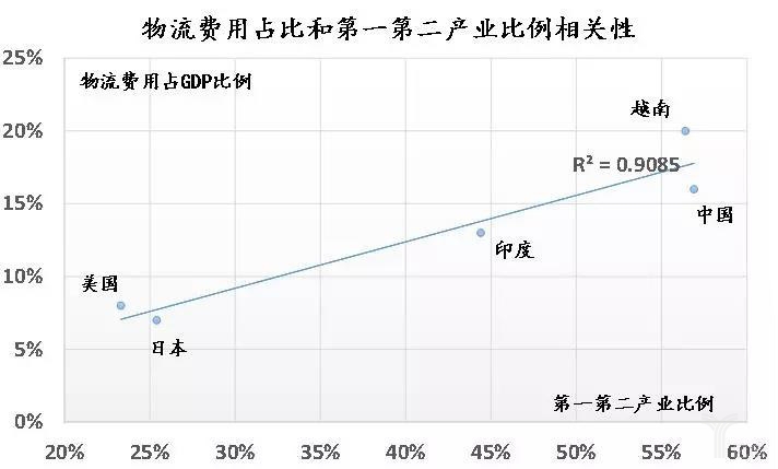 在農業、工業和服務業三大產業中,物流費用主要用于農業及工業,相對而言,服務業物流服務需求少。美國、日本、印度、中國、越南的第一第二產業比例和物流費用占GDP比例的相關性見下圖。很明顯,物流費用占GDP比例和第一第二產業比例高度相關,相關性達到0.9。