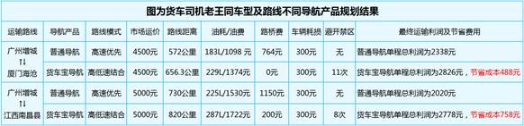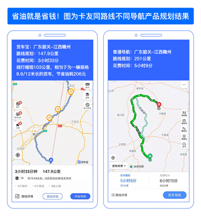 從實際測試結果來看,一卡友從韶關市南雄市323國道附近出發到江西省贛州市高興鎮,使用貨車寶比普通地圖導航路程節省103公里,相當于為一輛規格為9.6/12米長途貨車節省油耗206元。