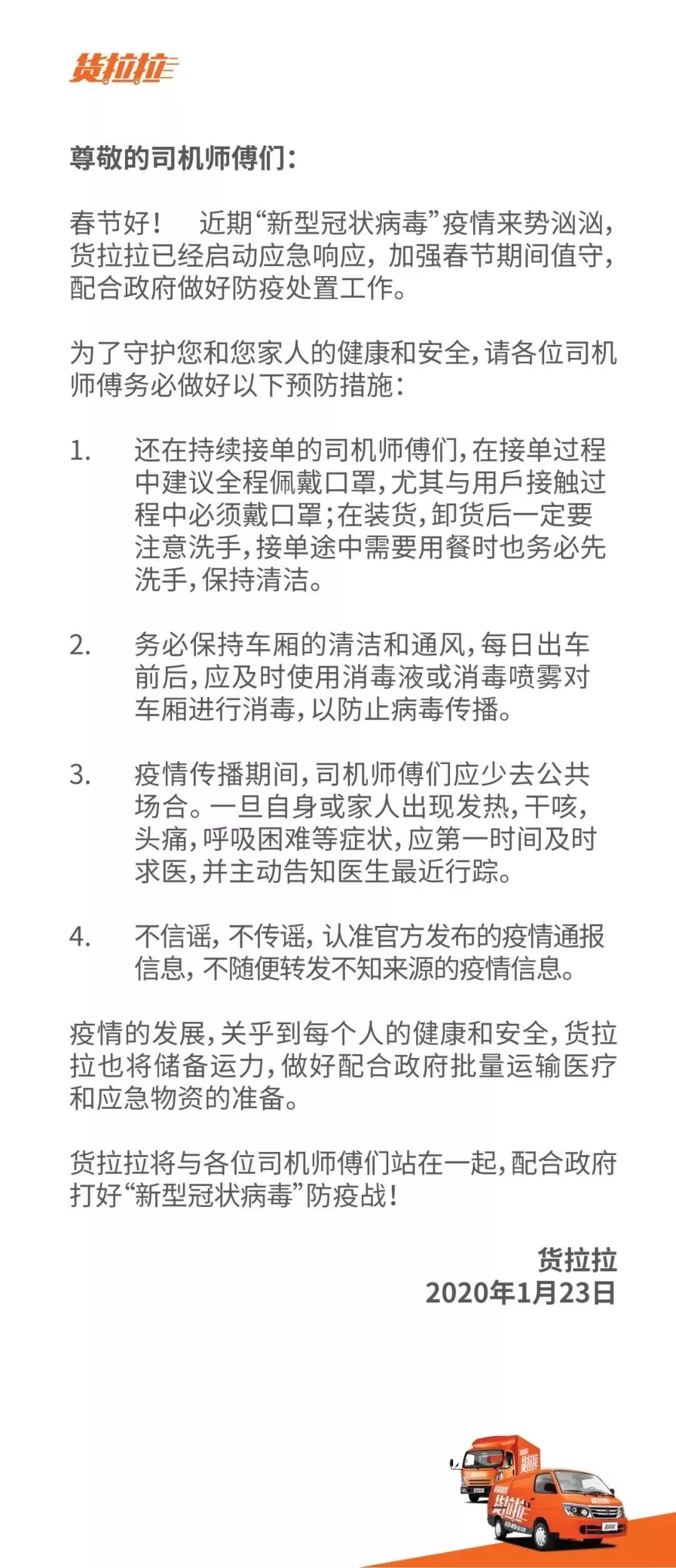 滿幫集團(tuán)成立由CEO張暉負(fù)責(zé)的應(yīng)急專班,開通平臺(tái)綠色服務(wù)通道,積極對(duì)接相關(guān)政府部門的運(yùn)輸需求。各級(jí)政府部門、正規(guī)醫(yī)療機(jī)構(gòu)、公益團(tuán)體,如有向武漢地區(qū)運(yùn)輸大宗救援物資的需求,請(qǐng)撥打滿幫應(yīng)急專班客服電話95006。爭(zhēng)渡網(wǎng)絡(luò)發(fā)布抗疫愛心儲(chǔ)備運(yùn)輸車輛征集倡議書,爭(zhēng)渡作為網(wǎng)絡(luò)貨運(yùn)平臺(tái)企業(yè),現(xiàn)向社會(huì)征集愛心普貨車輛,組建儲(chǔ)備車隊(duì),隨時(shí)接受長(zhǎng)沙市政府的統(tǒng)一調(diào)配,保障長(zhǎng)沙市及省內(nèi)應(yīng)急物資運(yùn)輸。我們將與政府一同規(guī)范司機(jī)朋友們的個(gè)人安全保障措施。愛心聯(lián)系電話:400-0067-789轉(zhuǎn)1 ,或17773148310。中交興路第一時(shí)間成立應(yīng)急小組,通過全國道路貨運(yùn)車輛公共監(jiān)管與服務(wù)平臺(tái),全力持續(xù)為馳援疫區(qū)的運(yùn)輸車輛提供安全提醒、防疫通知等安全保障服務(wù);并第一時(shí)間配合疫區(qū)交通運(yùn)輸主管部門管控調(diào)度社會(huì)營運(yùn)車輛。社會(huì)各界如對(duì)車輛安全保障和調(diào)度有任何需求,請(qǐng)隨時(shí)聯(lián)系中交興路應(yīng)急小組。聯(lián)系人:李女士,聯(lián)系電話:15011538291。應(yīng)急小組在車旺大卡app開設(shè)站內(nèi)防疫互助專區(qū),為卡車司機(jī)們提供預(yù)防疫情相關(guān)信息,同時(shí)還通過媒體、行業(yè)協(xié)會(huì)、物流兄弟公司以及近600萬大卡用戶等渠道收集救援、物資、互助等信息,與大卡司機(jī)守望相助!中交興路將持續(xù)關(guān)注疫情疫區(qū)情況發(fā)展,全力保障道路運(yùn)輸安全,與武漢、湖北地區(qū)人民一起,同抗疫情!