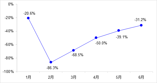 上半年,完成營業(yè)性客運量39.6億人,同比下降54.8%,6月已恢復(fù)至去年同期的56.3%,恢復(fù)程度較一季度末提高29.3個百分點。分方式看,公路客運量下降55.0%、水路客運量下降56.7%。