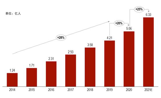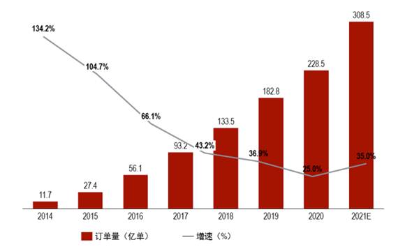 近年,即時配送行業從快速增長期逐步進入成熟發展期,市場規模增速趨于穩定。《報告》顯示,截至 2020 年,即時配送行業消費者規模達到 5.06 億人次,同比增速穩定在20%左右;年訂單量超過200 億單,同比增長25%,預計2021年訂單量將突破300億單。