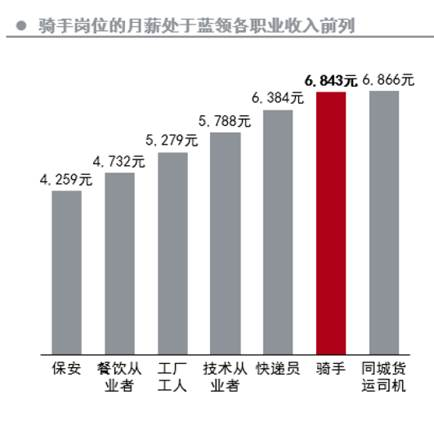 通過對供需雙方進行高效對接,即時配送還為從業者帶來相對穩定的收入來源。數據顯示,外賣騎手月均收入處于藍領職工前列,遠高于普通藍領的平均收入水平。