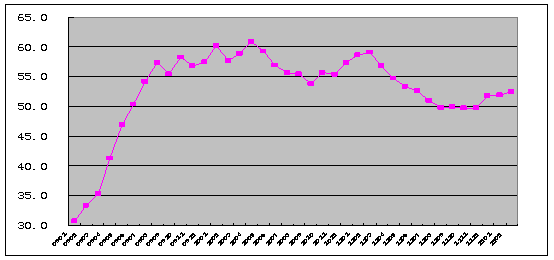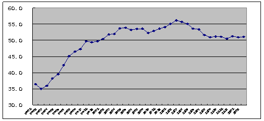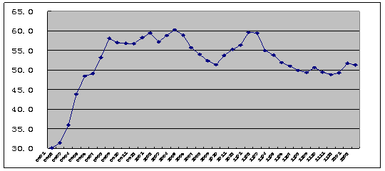 生產指數繼續回升。2月,生產指數為52.5%,較上月上升0.6個百分點。該指數已連續三個月保持在50%以上,本月達到自去年6月份以來的最高值,但同去年一季度相比,仍屬偏低。生產指數較高的國家主要是丹麥、南非、印度和美國。在制造業大國中,日本、德國、英國生產指數上升。
