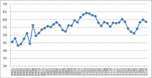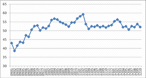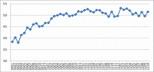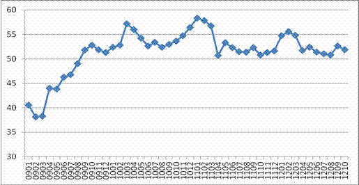 10月,日本服務業的商務活動指數為由上月的48.9%回升50%的臨界點,結束了連續五個月的下降走勢。與商務活動一樣,新訂單與上月相比也沒有發生變化,指數維持在50%的臨界點。但從業人員指數顯示就業活動仍在下降。同時,收費價格指數繼續下降,創出2011年2月以來的最低水平。但中間投入價格指數較為穩定,沒有出現明顯上升,為企業經營提供了發展空間。日本服務企業對未來12月的市場前景仍保持樂觀預期。